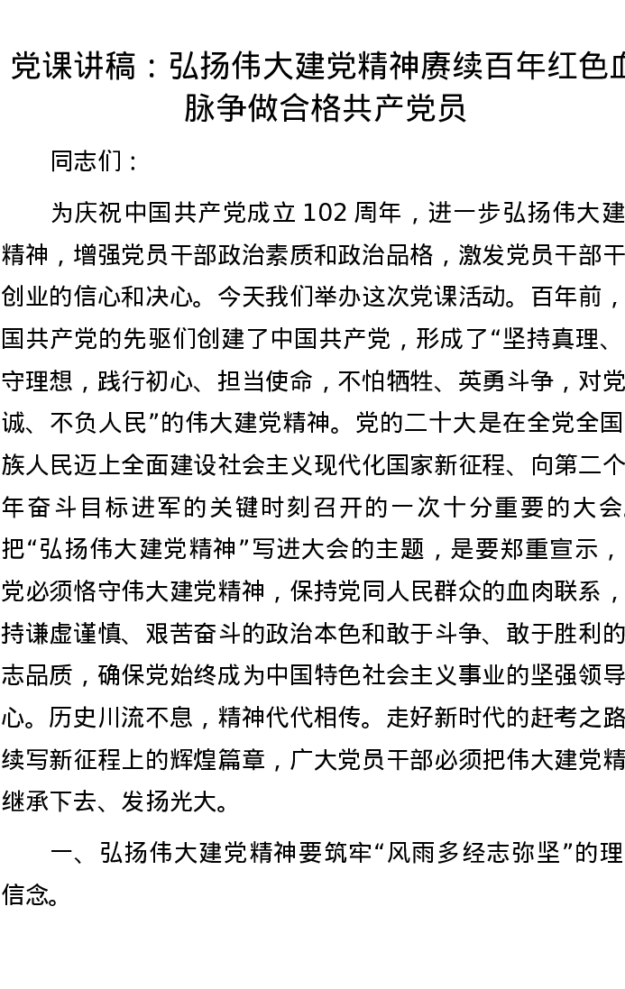 党课讲稿:弘扬伟大建党精神 赓续百年红色血脉 争做合格共产党员