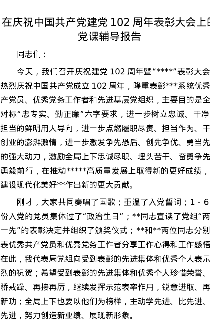 在庆祝中国共产党建党102周年表彰大会上的党课辅导报告
