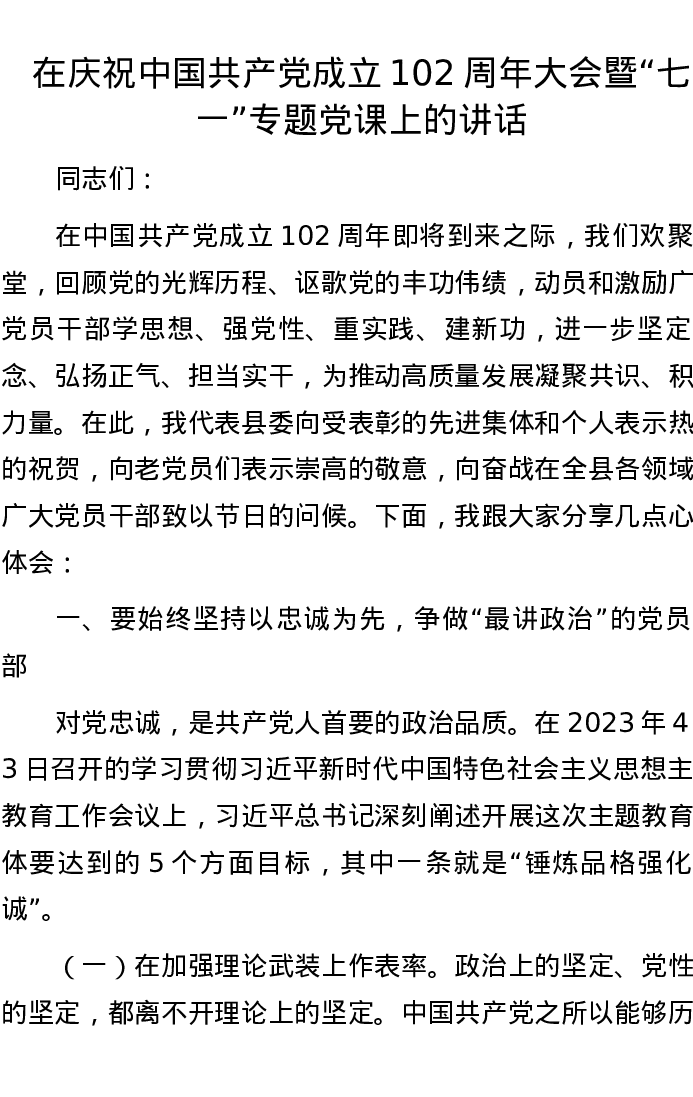 在庆祝中国共产党成立102周年大会暨“七一”专题党课上的讲话