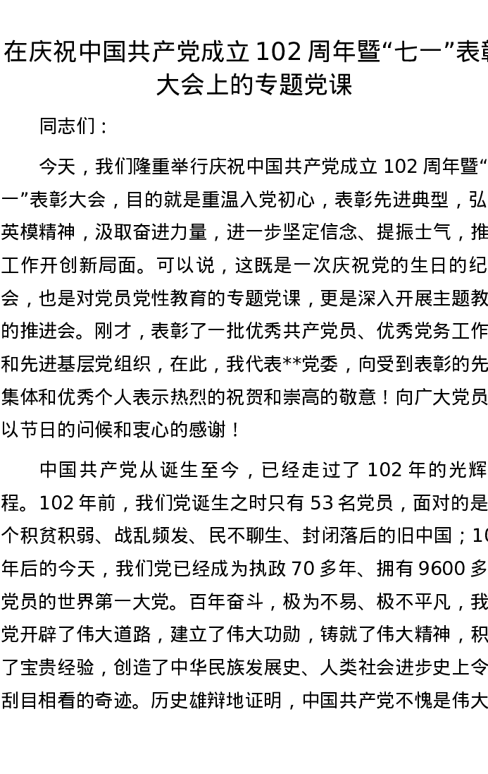 在庆祝中国共产党成立102周年暨“七一”表彰大会上的专题党课