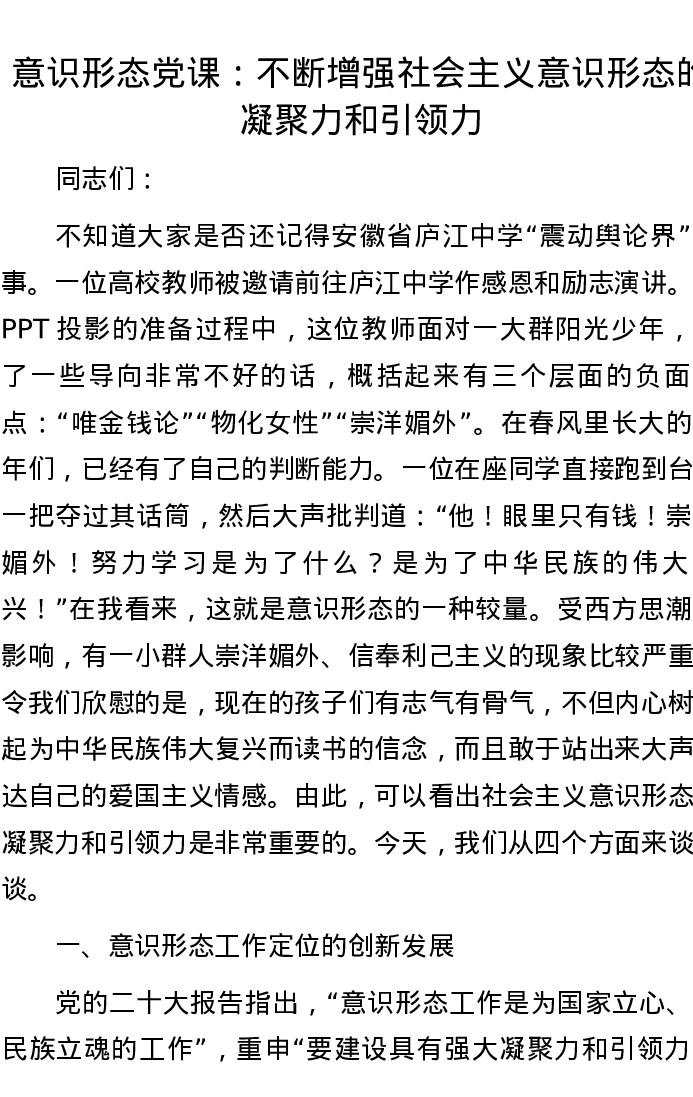 意识形态党课:不断增强社会主义意识形态的凝聚力和引领力