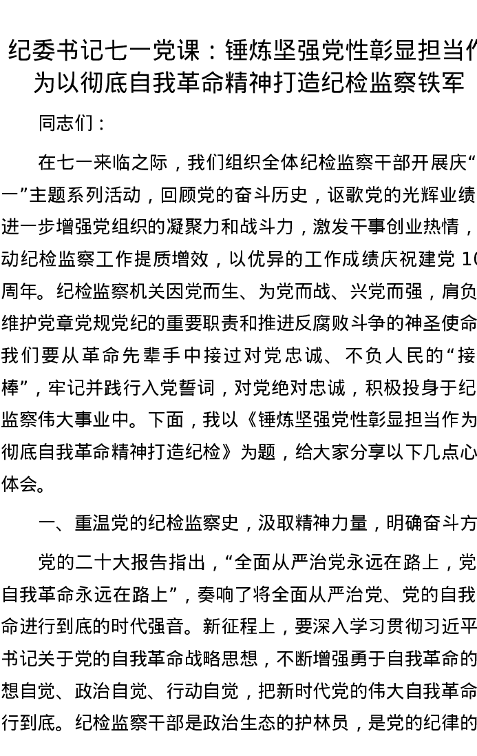 纪委书记七一党课:锤炼坚强党性 彰显担当作为 以彻底自我革命精神打造纪检监察铁军