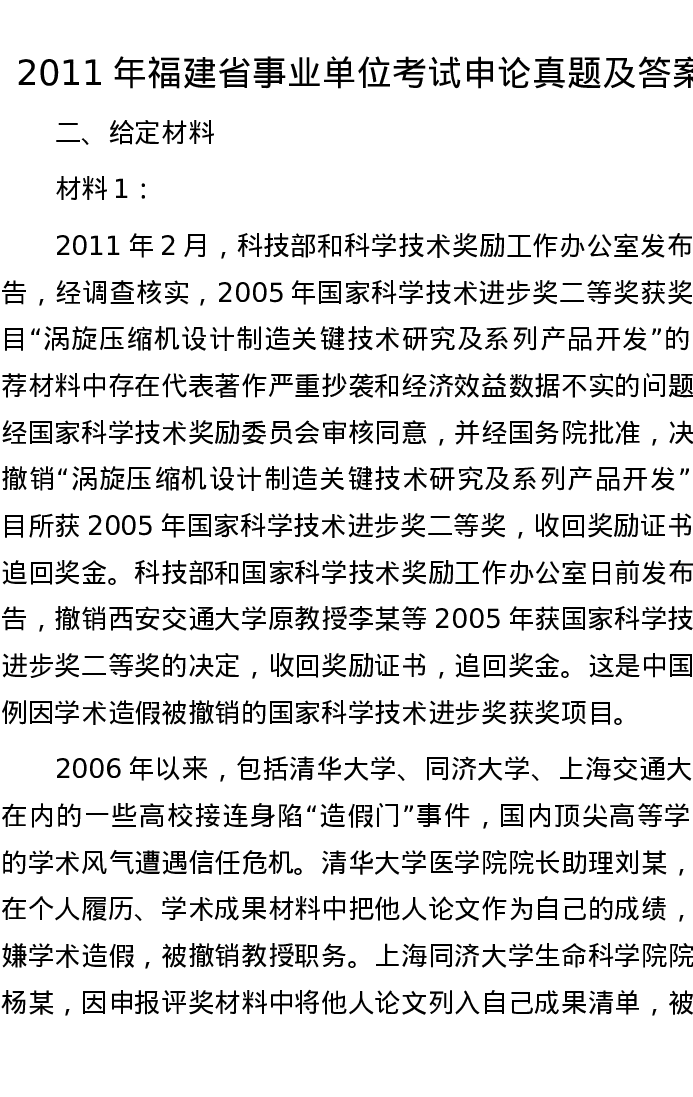 2011年福建省事业单位考试申论真题及答案