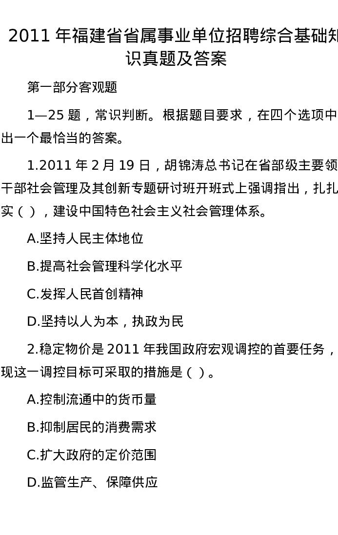 2011年福建省省属事业单位招聘综合基础知识真题及答案