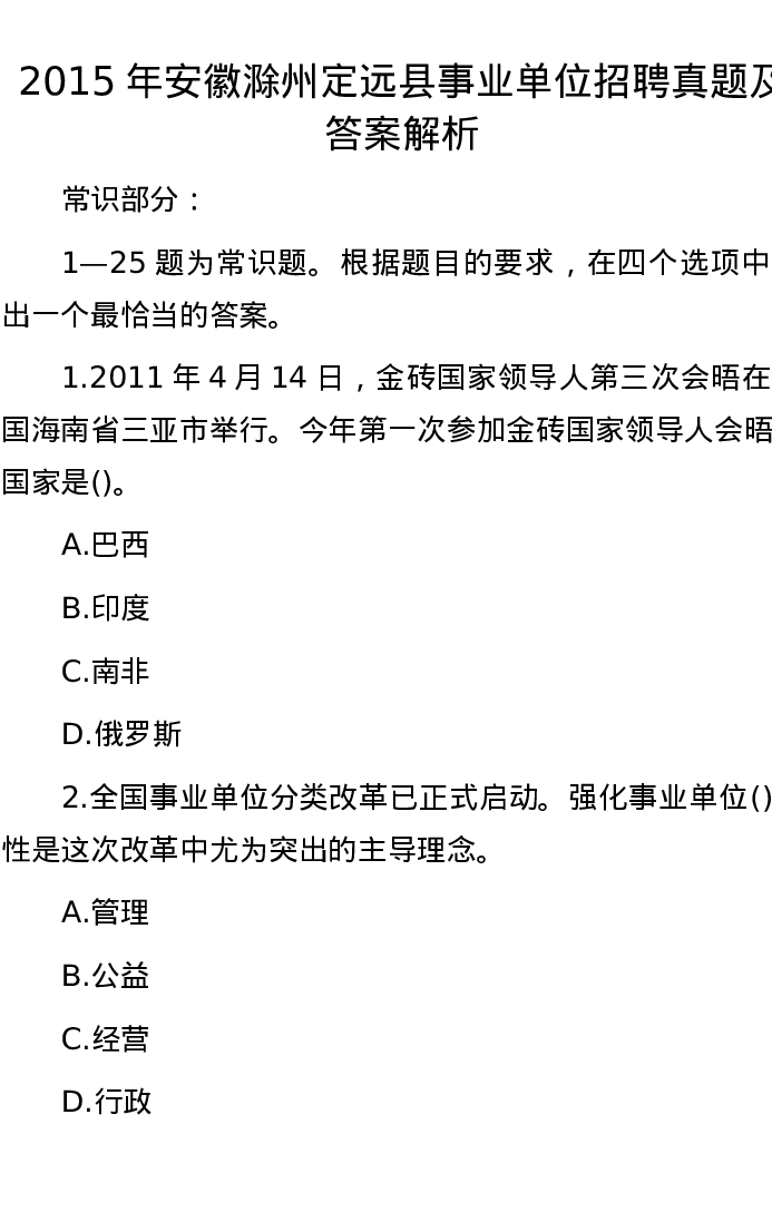 2015年安徽滁州定远县事业单位招聘真题及答案解析