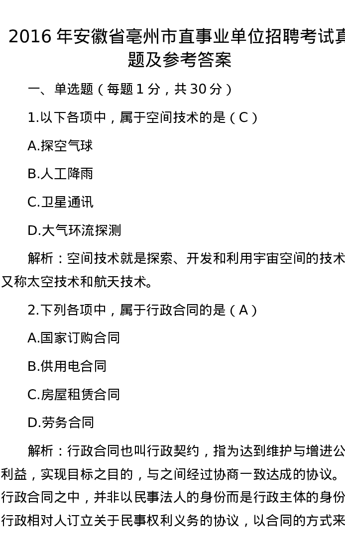 2016年安徽省亳州市直事业单位招聘考试真题及参考答案
