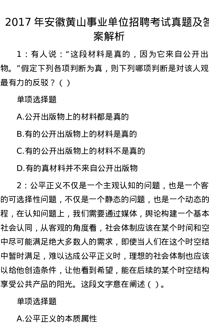2017年安徽黄山事业单位招聘考试真题及答案解析