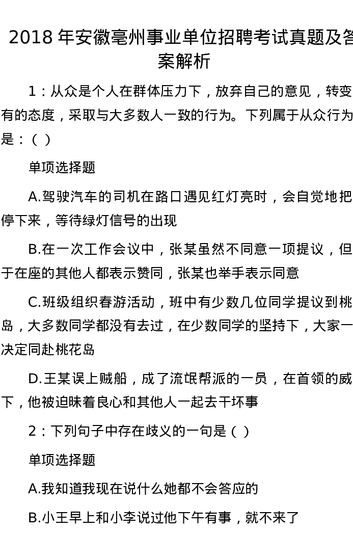 2018年安徽亳州事业单位招聘考试真题及答案解析