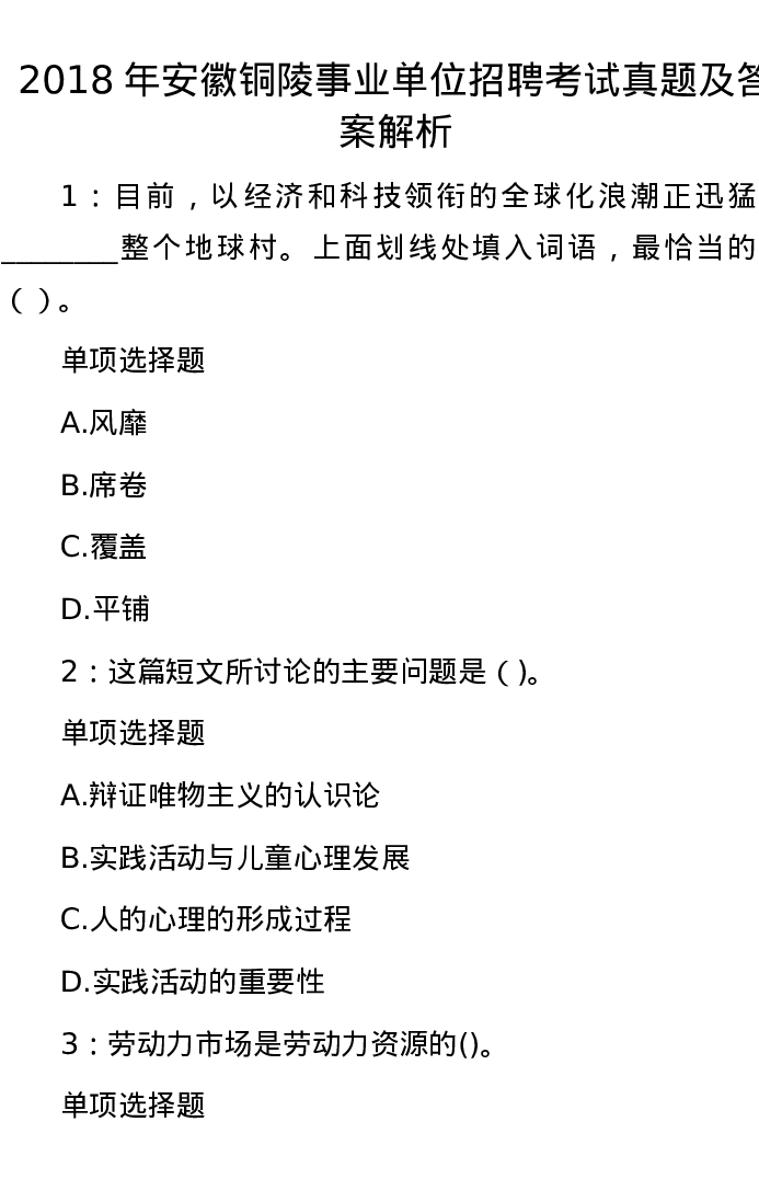 2018年安徽铜陵事业单位招聘考试真题及答案解析