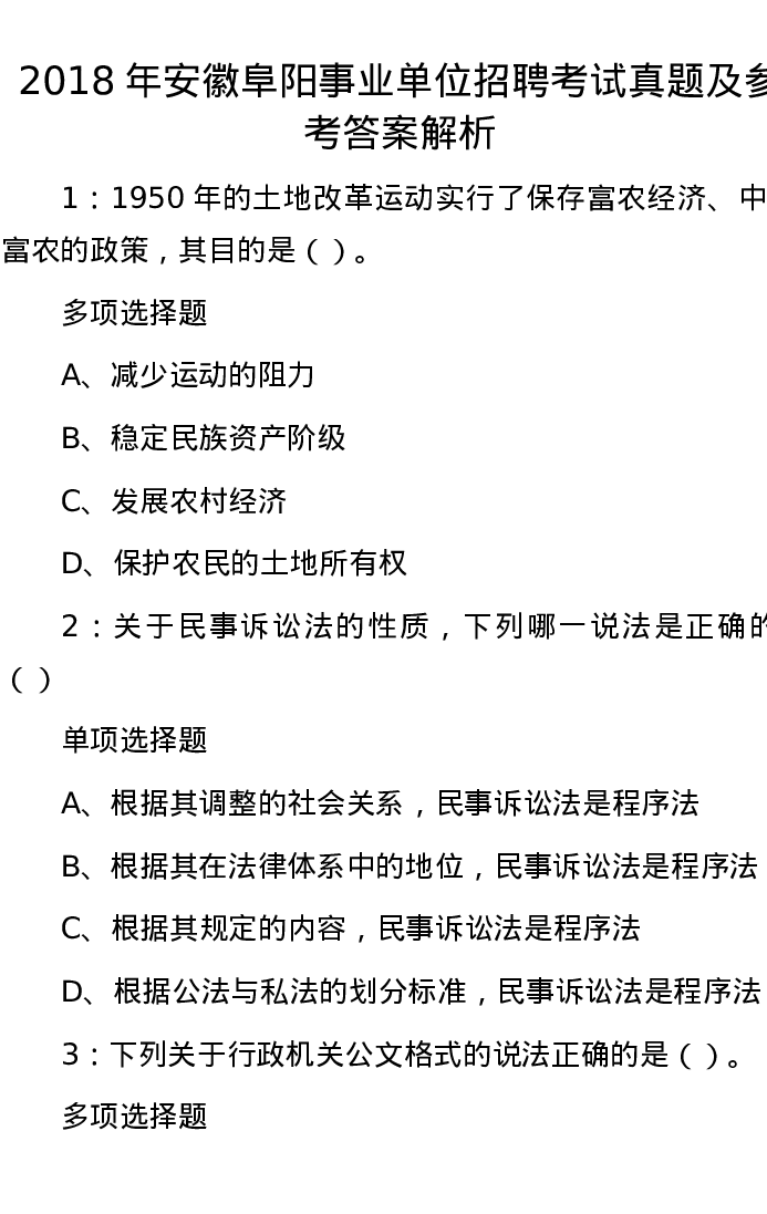 2018年安徽阜阳事业单位招聘考试真题及参考答案解析
