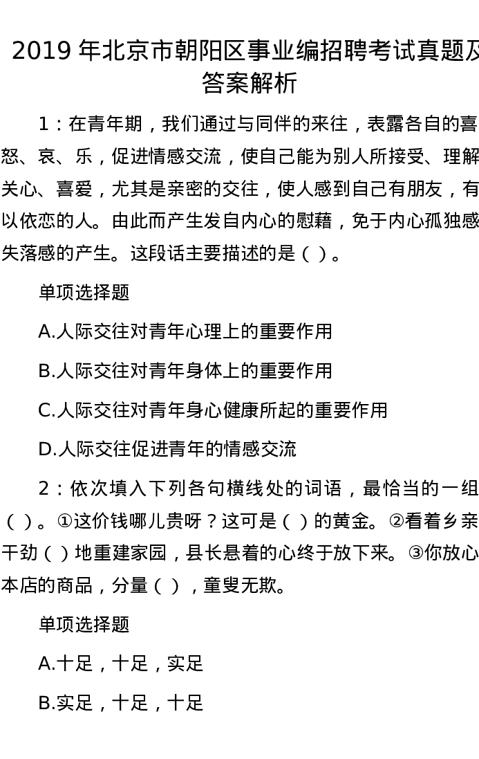 2019年北京市朝阳区事业编招聘考试真题及答案解析