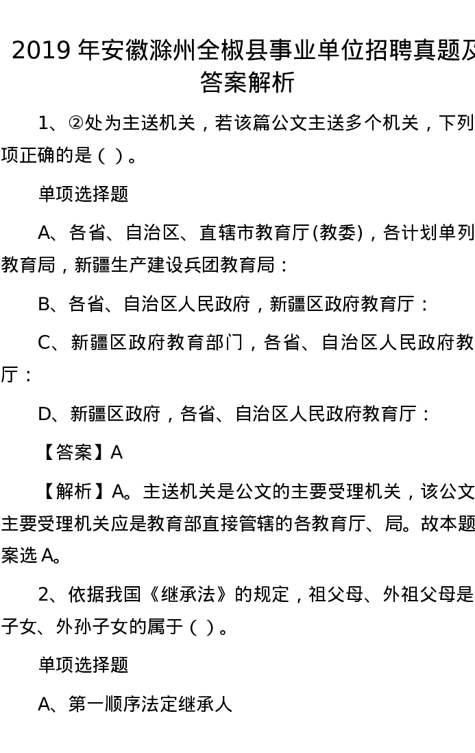 2019年安徽滁州全椒县事业单位招聘真题及答案解析