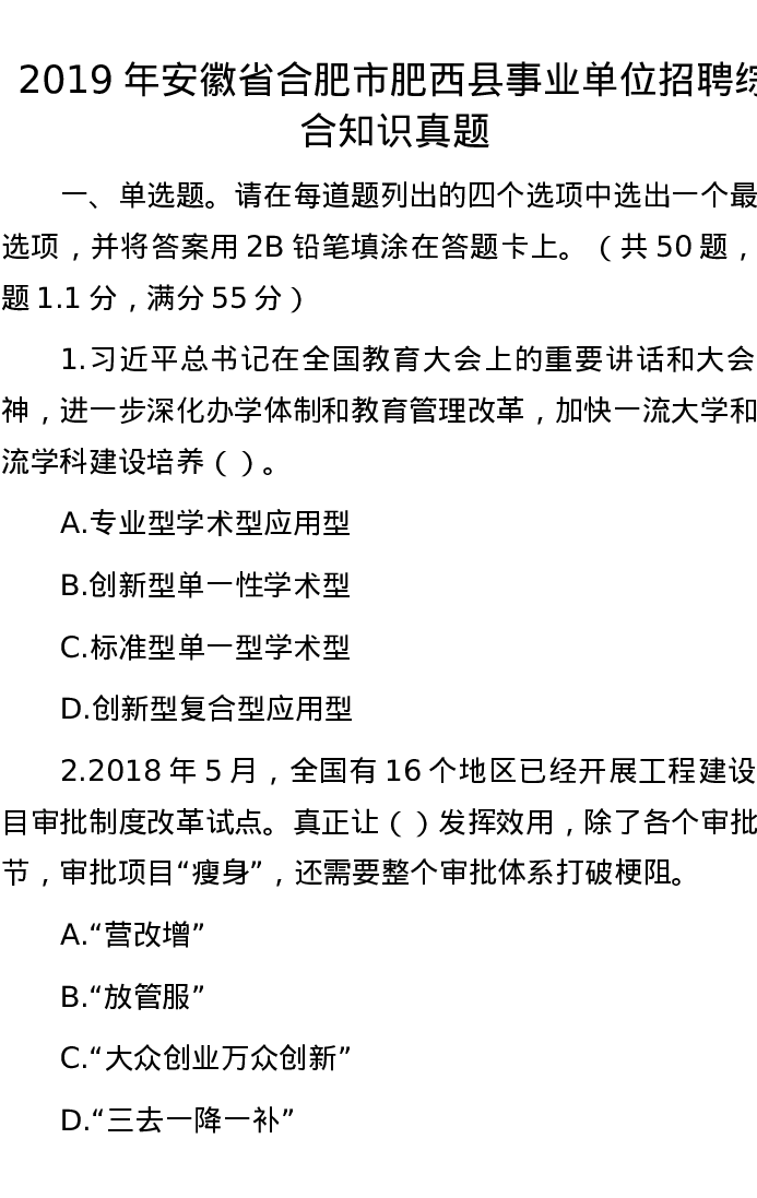 2019年安徽省合肥市肥西县事业单位招聘综合知识真题