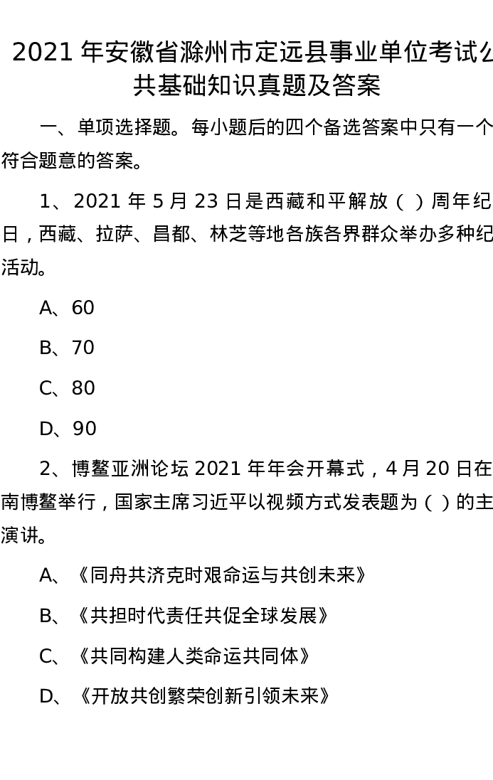 2021年安徽省滁州市定远县事业单位考试公共基础知识真题及答案