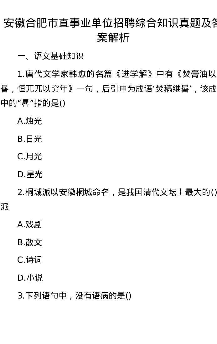 安徽合肥市直事业单位招聘综合知识真题及答案解析
