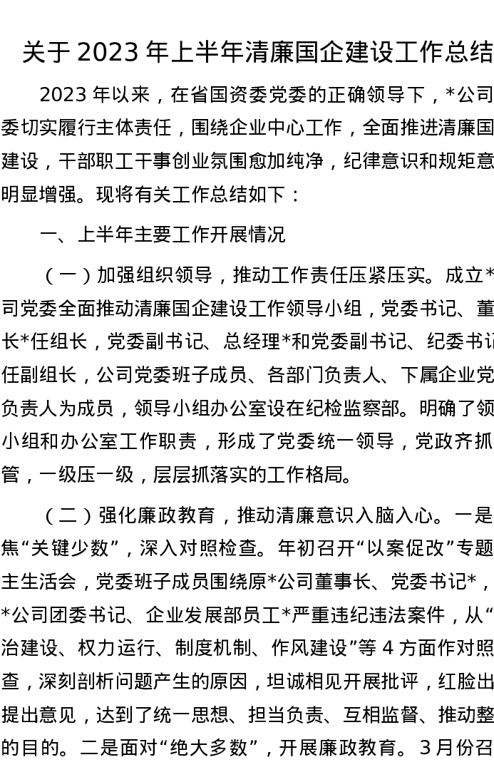 关于2023年上半年清廉国企建设工作总结