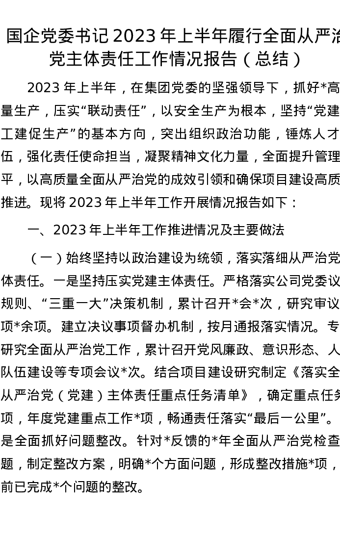 国企党委书记2023年上半年履行全面从严治党主体责任工作情况报告(总结)