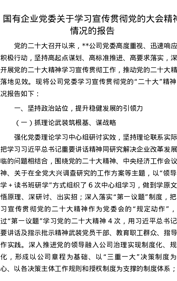 国有企业党委关于学习宣传贯彻党的大会精神情况的报告