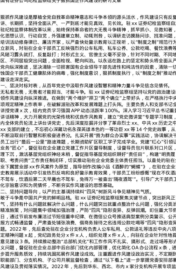 国有证券公司纪检监察组关于狠抓国企作风建设的研讨文章