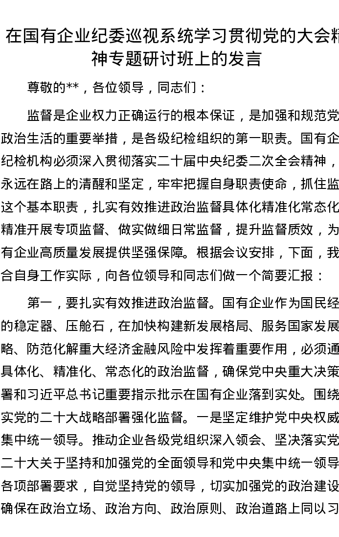 在国有企业纪委巡视系统学习贯彻党的大会精神专题研讨班上的发言