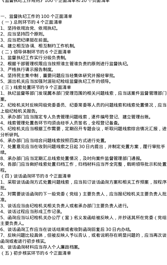 《监督执纪工作规则》100个正面清单和20个负面清单