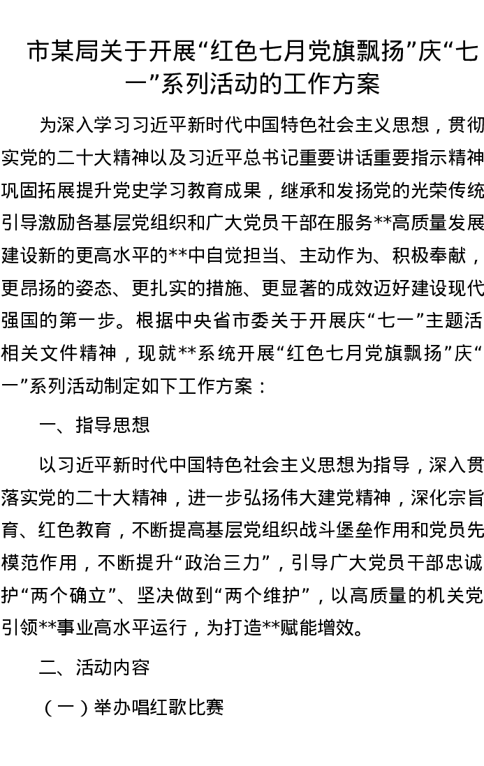 市某局关于开展“红色七月 党旗飘扬”庆“七一”系列活动的工作方案
