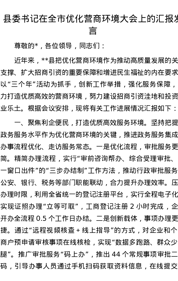 县委书记在全市优化营商环境大会上的汇报发言