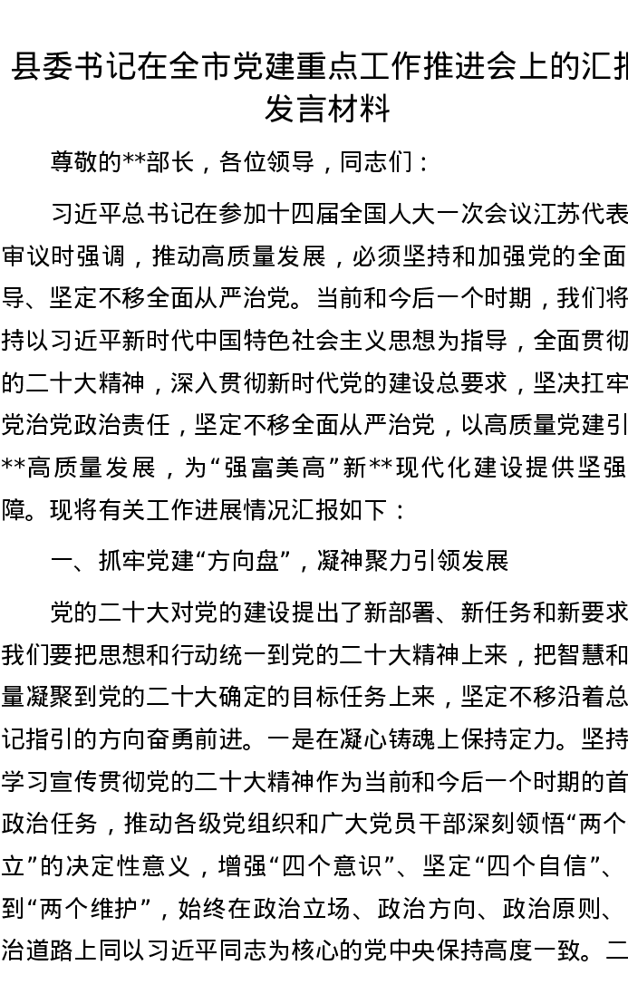 县委书记在全市党建重点工作推进会上的汇报发言材料