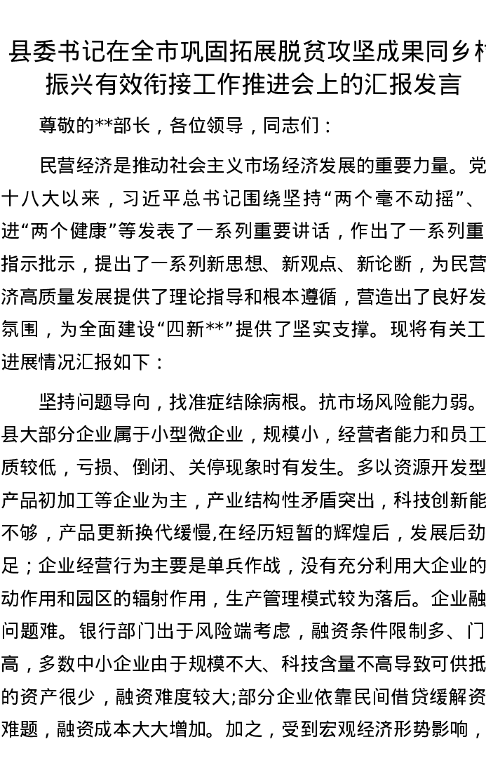 县委书记在全市巩固拓展脱贫攻坚成果同乡村振兴有效衔接工作推进会上的汇报发言