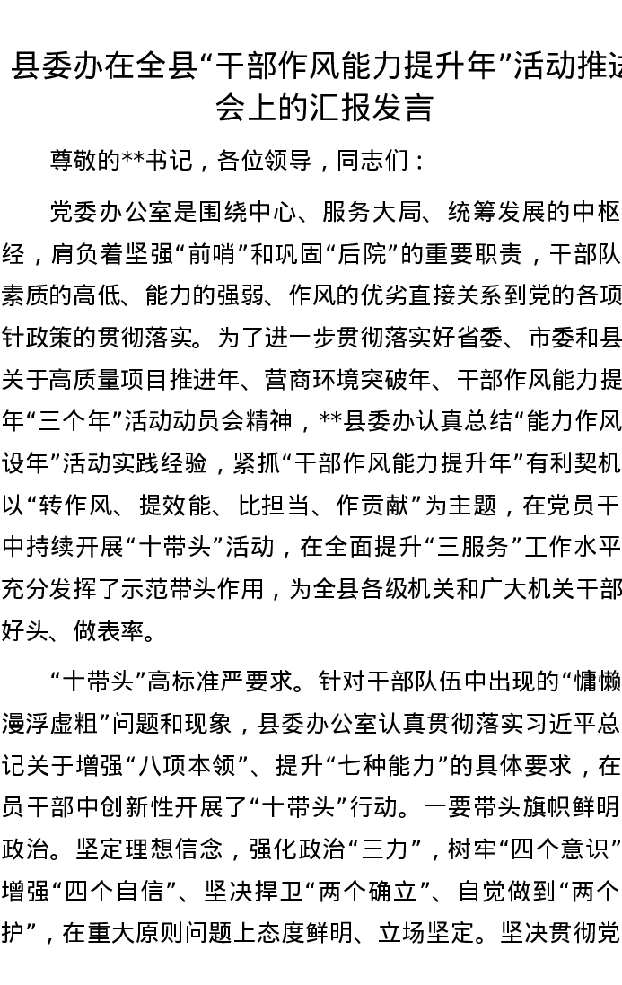 县委办在全县“干部作风能力提升年”活动推进会上的汇报发言