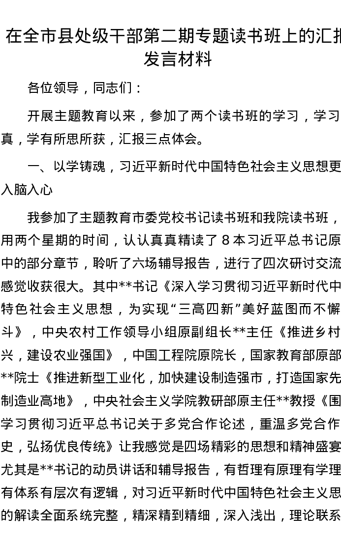 在全市县处级干部第二期专题读书班上的汇报发言材料