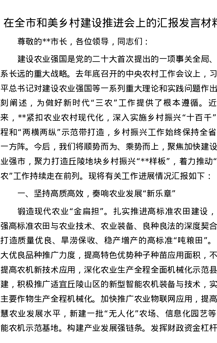 在全市和美乡村建设推进会上的汇报发言材料