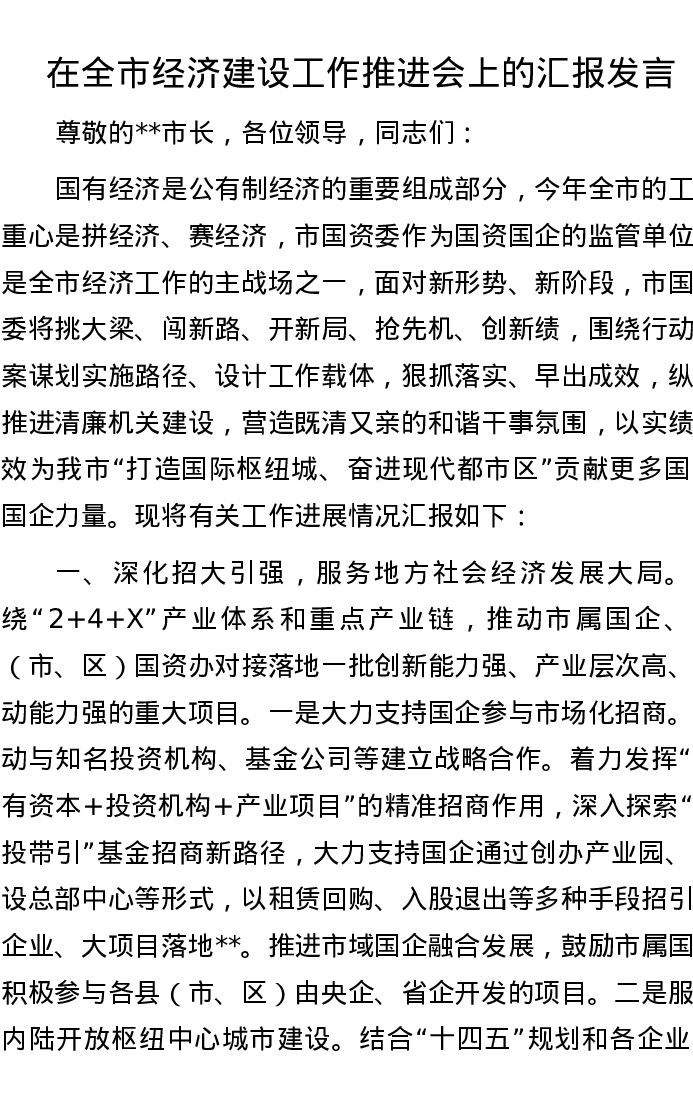 在全市经济建设工作推进会上的汇报发言