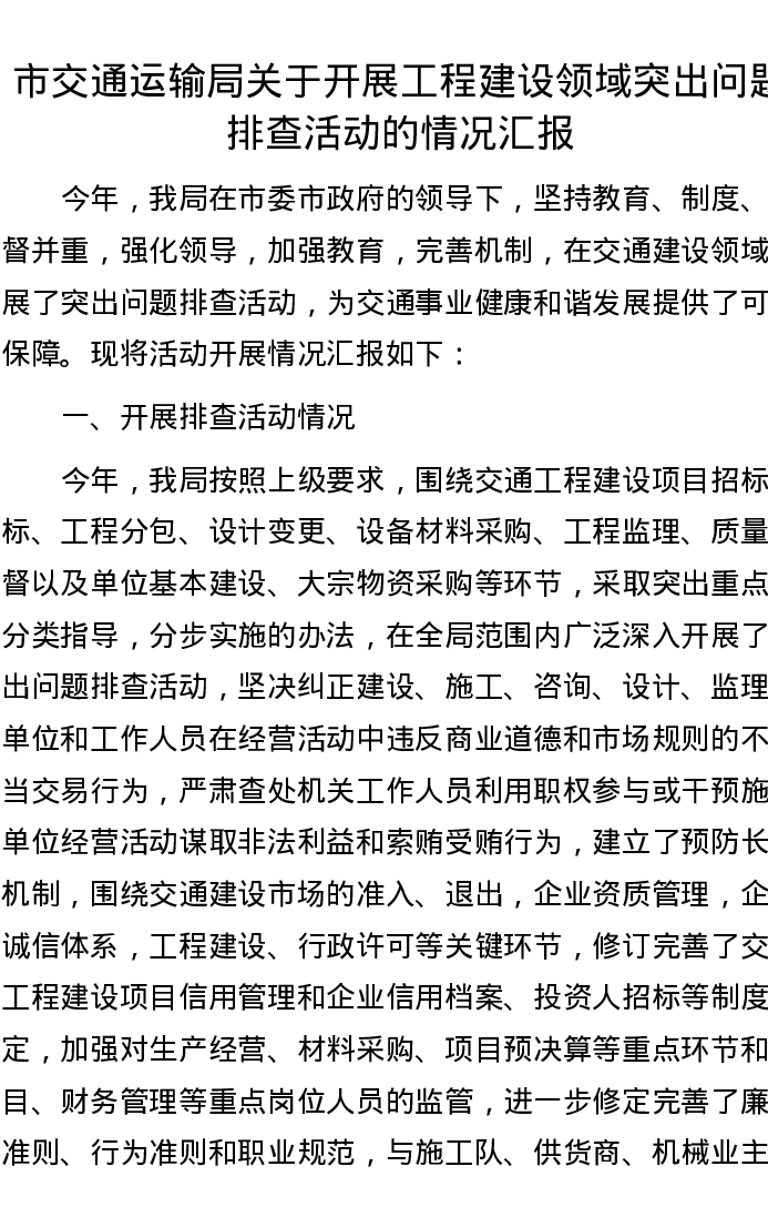 市交通运输局关于开展工程建设领域突出问题排查活动的情况汇报
