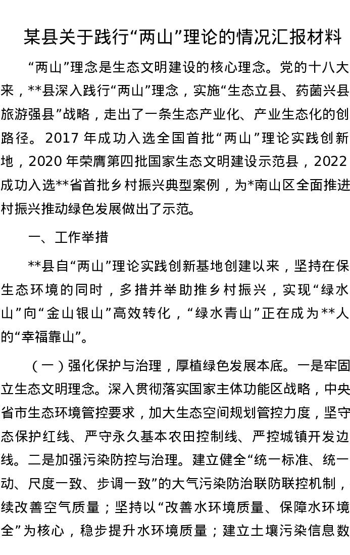 某县关于践行“两山”理论的情况汇报材料