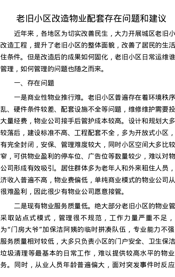 老旧小区改造物业配套存在问题和建议