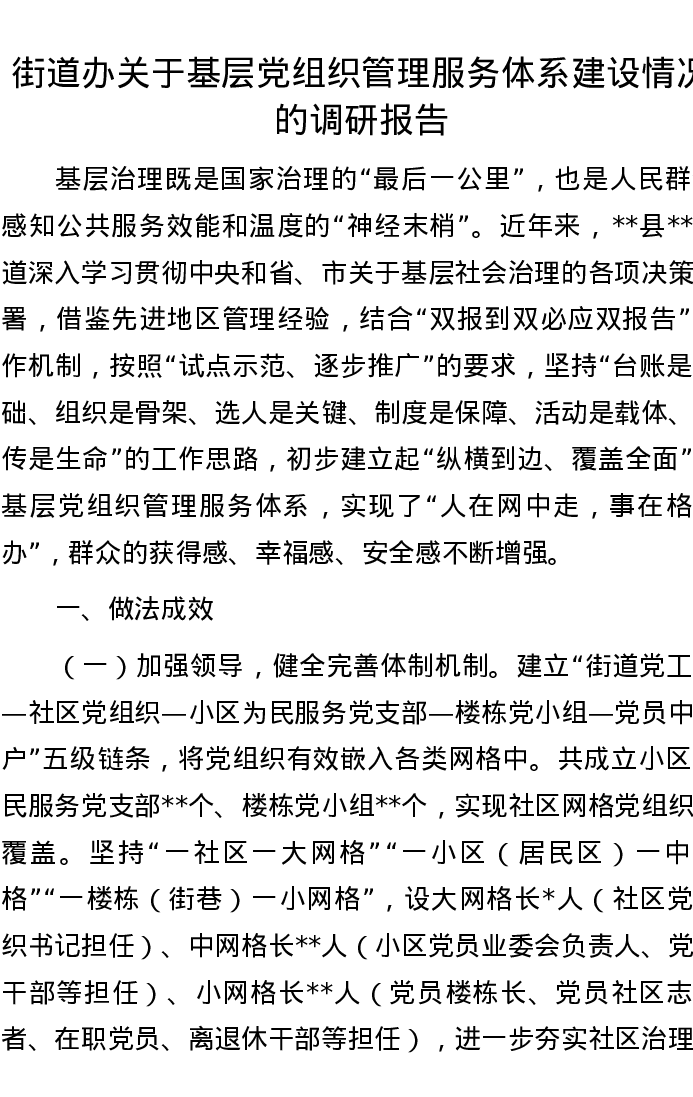 街道办关于基层党组织管理服务体系建设情况的调研报告