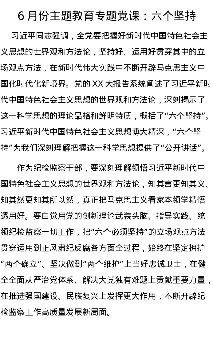 6月份主题教育专题党课:六个坚持(特色社会主义思想)