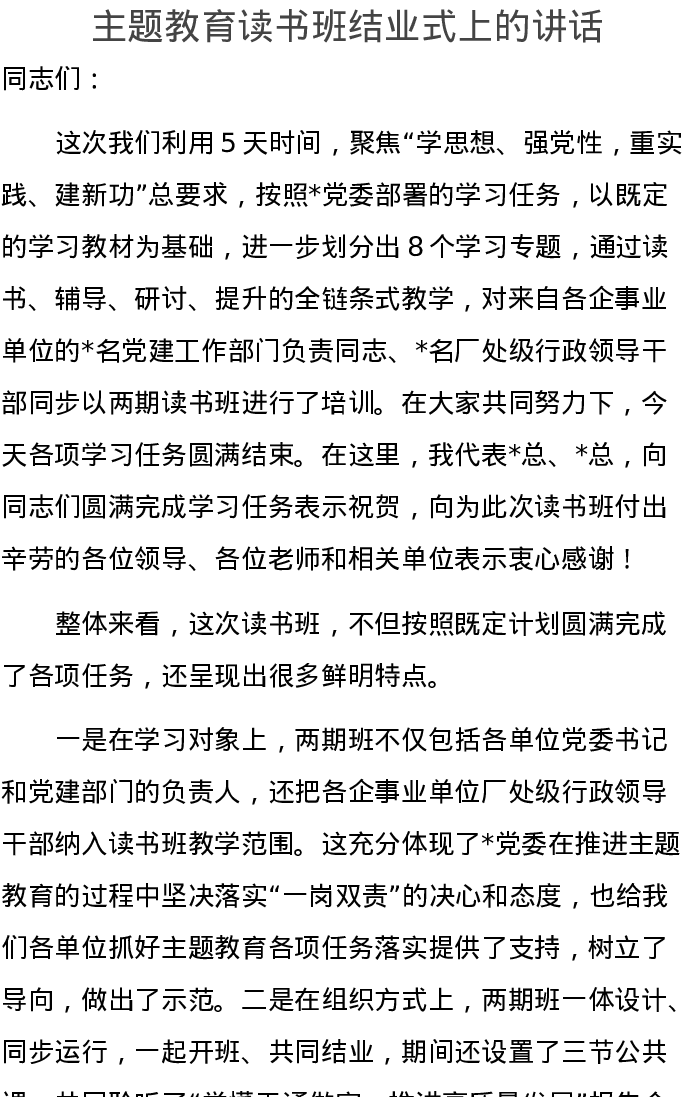 主题教育读书班结业式上的讲话(特色社会主义思想)