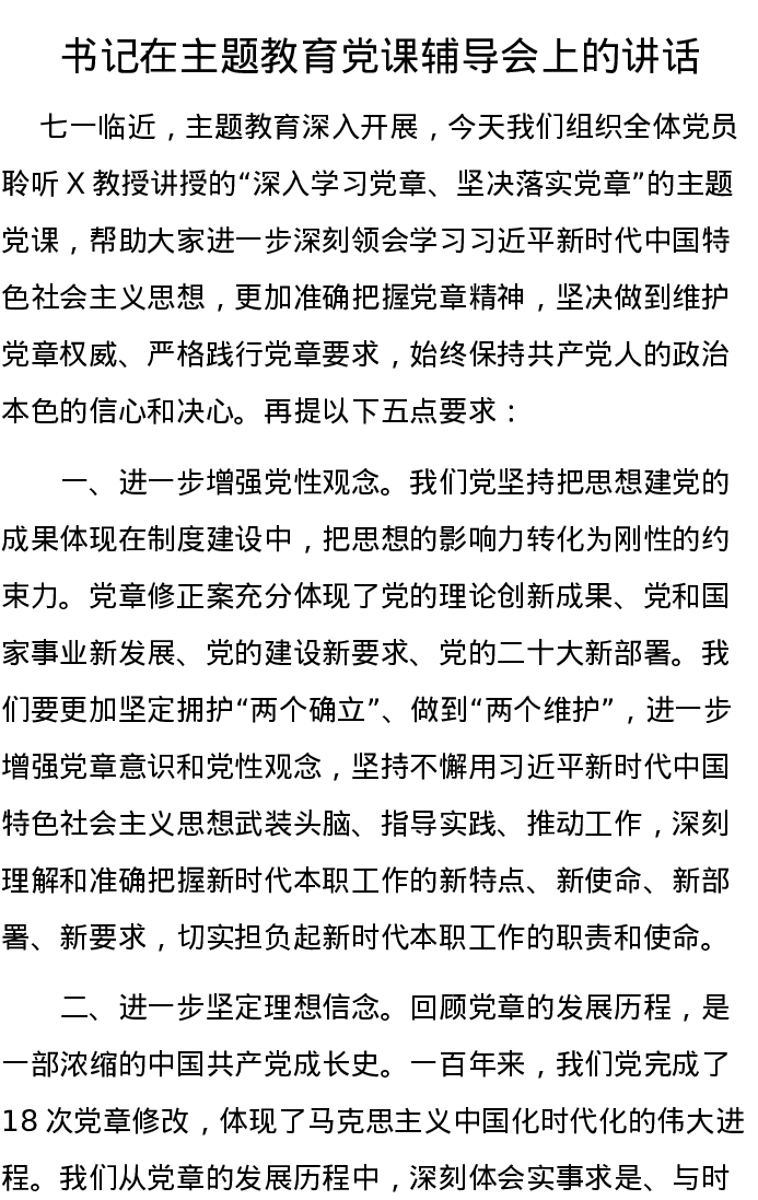 书记在主题教育党课辅导会上的讲话(特色社会主义思想)
