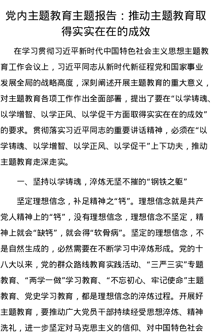 党内主题教育主题报告:推动主题教育取得实实在在的成效(特色社会主义思想)