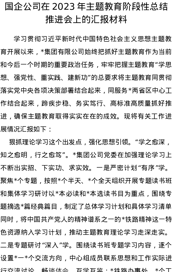国企公司在2023年主题教育阶段性总结推进会上的汇报材料(特色社会主义思想)