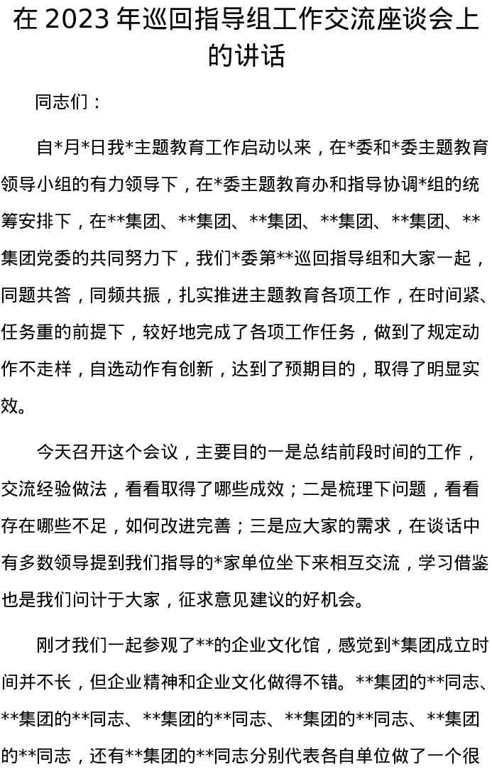 在2023年主题教育巡回指导组工作交流座谈会上的讲话(特色社会主义思想)