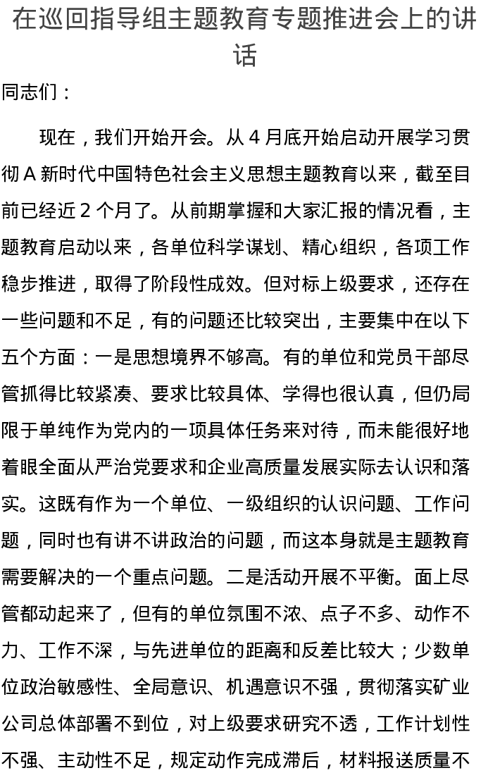 在巡回指导组主题教育专题推进会上的讲话(特色社会主义思想)