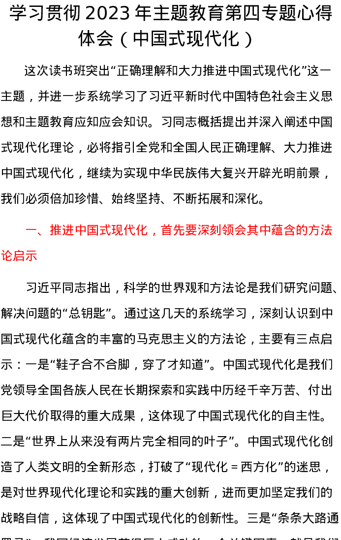 学习贯彻2023年主题教育第四专题心得体会1-中国式现代化(特色社会主义思想)