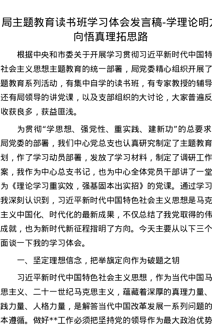 局主题教育读书班学习体会发言稿-学理论明方向 悟真理拓思路