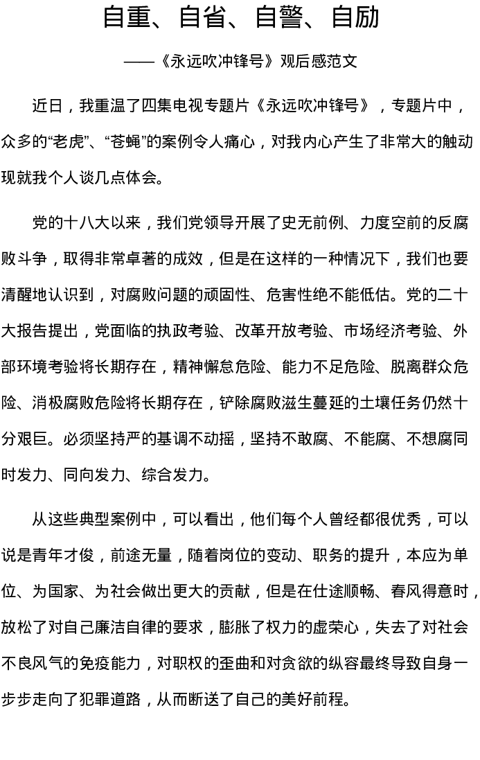 《永远吹冲锋号》观后感:自重、自省、自警、自励(廉政警示教育学习心得体会、研讨发言材料)