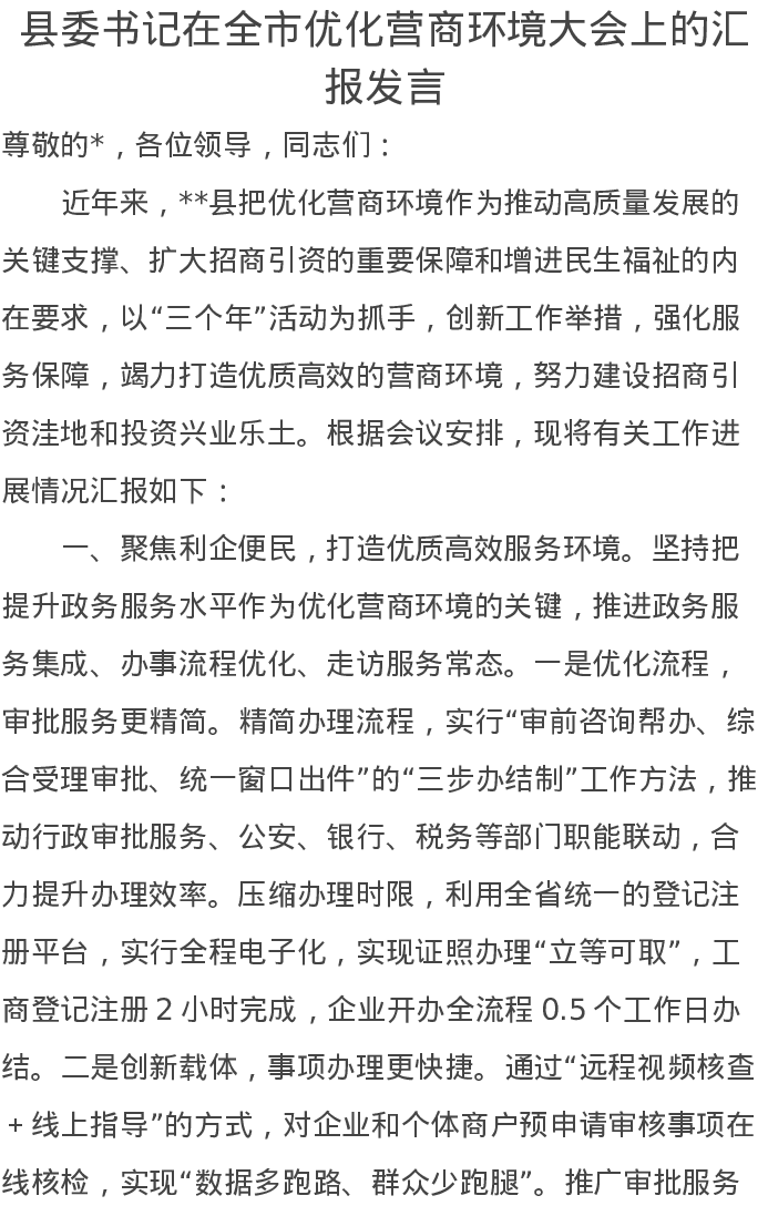 县委书记在全市优化营商环境大会上的汇报发言
