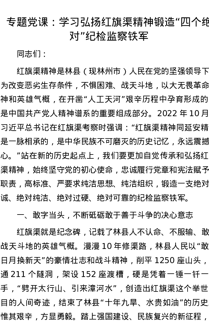 专题党课:学习弘扬红旗渠精神 锻造“四个绝对”纪检监察铁军
