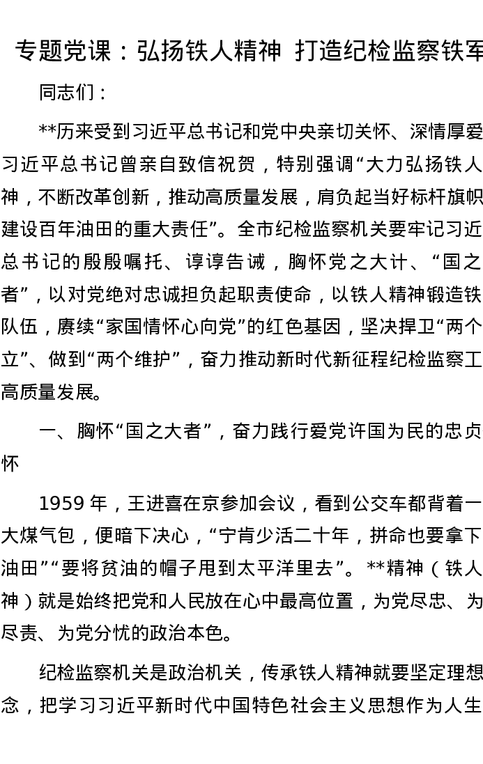 专题党课:弘扬铁人精神 打造纪检监察铁军